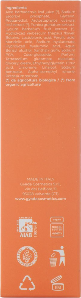 Aloe Barbadensis Leaf Juice[1], Sodium Ascorbyl Phosphate (Vitamin C), Glycerin, Propandiol, Arctostaphylos Uva Ursi (Bearberry) Leaf Extract[1], Punica Granatum (Pomegranate) Extract, Lycium Barbarum (Goij) Fruit Extract[1], Hydrolyzed Verbascum Thapsus Flower, Betaine, Lactobionic Acid, Ferulic Acid, Mandelic Acid, Sodium Hyaluronate, Hydrolyzed Hyaluronic Acid, Aqua, Benzyl Alcohol, Xanthan Gum, Sodium Pca, Coco Glucoside, Parfum, Tetrasodium Glutamate Diacetate, Glyceryl Oleate, Ethylhexylglycerin, Citricacid, Limonene, Linalool, Sodium Benzoate, Alpha-Isomethyl Ionone, Potassium Sorbate