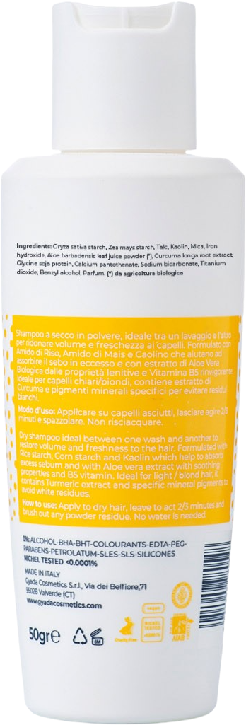 Dieses Trockenshampoo wurde eigens für blondes Haar formuliert. Es enthält Kurkuma-Extrakte sowie spezielle mineralische Pigmente, die weiße Rückstände auf dem Haar verhindern. Das Produkt ist ideal um dem Haar zwischen zwei Wäschen neues Volumen und Frische zu verleihen. Seine Rezeptur auf Basis von Stärke aus Reis und Mais sowie Kaolin absorbiert überschüssiges Sebum, während beruhigende Bio-Aloe Vera und vitalisierendem Vitamin B5.