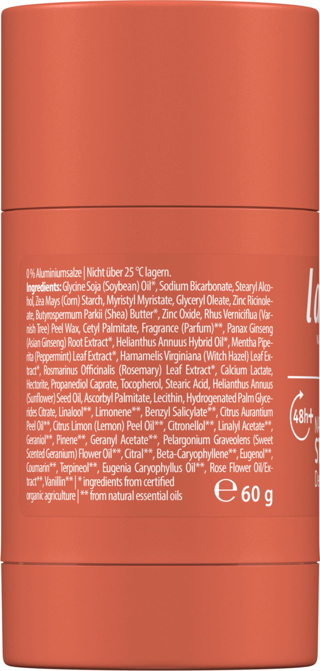 | Anwendung: | Trage den Deo-Stick mit leichtem Druck gleichmäßig in der gesamten Achsel auf und lasse sie vor dem Kontakt mit Kleidung vollständig trocknen. Nicht bei irritierter Haut verwenden. |
