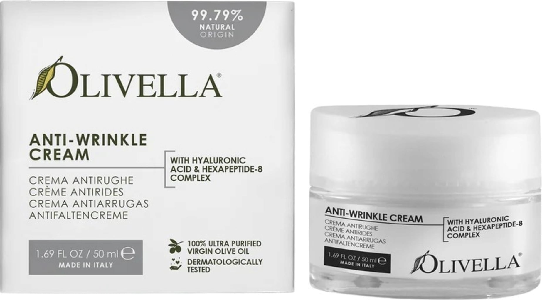 Aqua, Caprylic/Capric Triglyceride, Cetearylalcohol, Dicaprylyl Ether, Glyceryl Stearate, Glycerin, Olea Europaea (Olive) Fruit Oil, Olea Europaea (Olive) Leaf Extract, Sodium Hyaluronate, Acetyl Hexapeptide-8, Punica Granatum (Pomegranate) Fruit Extract, Gardenia Jasminoides Fruit Extract, Tocopherol (Vitamin E), Ascorbyl Palmitate, Xanthan Gum, Parfum, Sodium Benzoate, Potassium Sorbate, Citric Acid, Ethylhexylglycerin, Benzyl Alcohol, Cinnamal, Citronellol, Geraniol, Hexyl Cinnamal, Hydroxy Citronellal, Limonene, Linalool