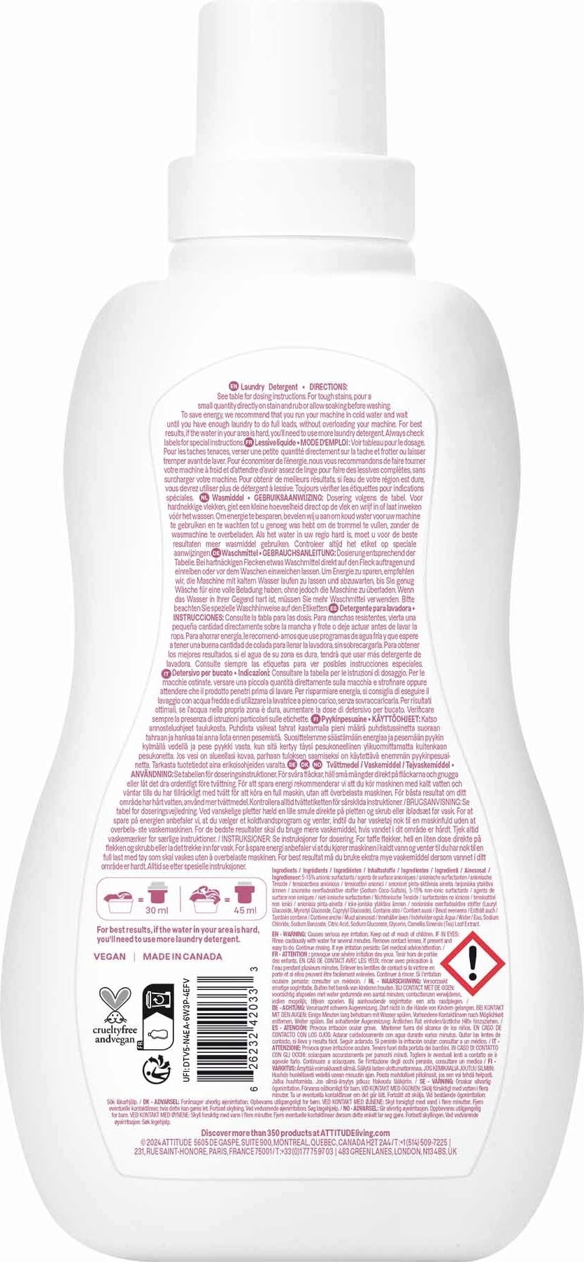 Dit vloeibare wasmiddel van ATTITUDE is geurloos en speciaal ontwikkeld voor baby- en kinderwasjes. Lakenluiers, dekens, slabbetjes en rompertjes worden op natuurlijke wijze en zonder geurstoffen gereinigd. Tegelijkertijd beschermt de formule het milieu.