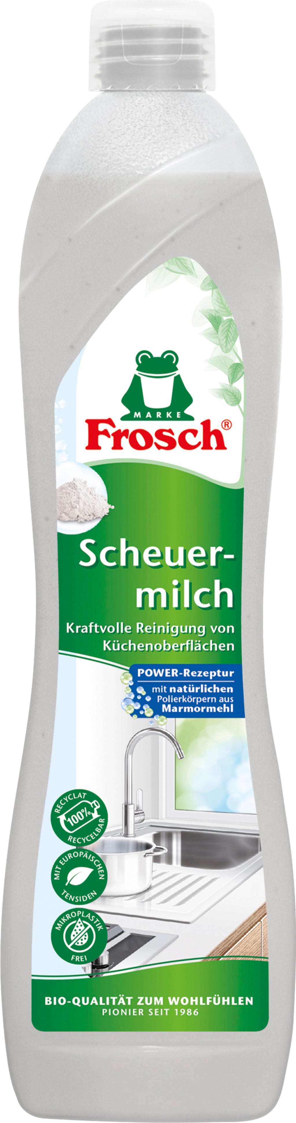 Met Frosch Schuurmiddel geef je je keuken en badkamer moeiteloos een nieuwe glans! Het maakt gebruik van de natuurlijke kracht van fijn marmerpoeder, dat je oppervlakken mechanisch polijst en voorzichtig maar stevig vuil verwijdert van roestvrij staal, email of glaskeramiek.