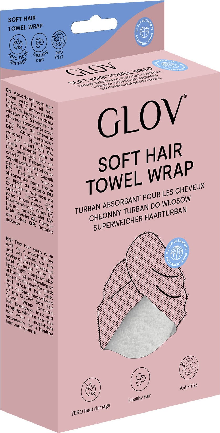 De Soft Hair Wrap van GLOV is een lichte, compacte tulband gemaakt van donzige, zachte microvezels en helpt het haar sneller te drogen zonder de structuur te beschadigen. Dit maakt hem ideaal voor in het zwembad, de sportschool of op reis. Dankzij het ingenieuze ontwerp houdt het betrouwbaar op het hoofd en neemt het vocht uit het haar op, terwijl de tijd kan worden gebruikt voor andere dingen, zoals verzorgingsrituelen, aankleden, make-up aanbrengen, enz.