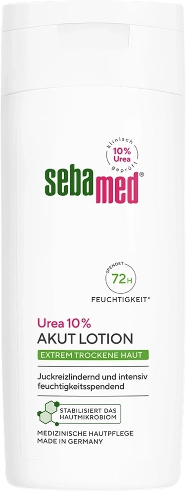 De Acuut Lotion Urea 10% van sebamed is ideaal voor de droge tot zeer droge huid. De microplasticvrije lotion voorziet de huid intensief van vocht en voedt de huid tot diep in de huid. Amandelolie zorgt bovendien voor een aangenaam gevoel op de huid.